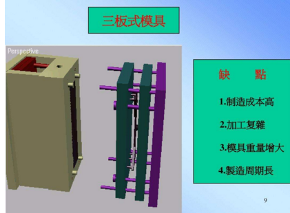 細水口模具又叫三板式模具,的流道及澆口不在分型線上,一般直接在產品上,所以我們在設計的時候多一組水口分模線,設計較為復雜,加工較困難,一般要視產品和客戶要求而選用細水口系統。這種模具的澆口位置選擇的地方比較多,而且開模時流道澆口與產品會自動分開,也省去了剪澆口這一步驟,被稱呼為三板式模具